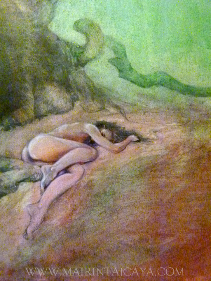 This piece is an interpretation of the place, the sacred space, where she might need to go to be alone, to be unburdened, uncovered, unseen by her male counterpart, and uncaught, as well. She rests, in the safe place, in the circle, at the foot at a strong, universal icon for the natural world. There is nothing else but the tree, and her.